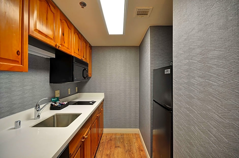 This suite features an accessible bath tub with grab bars separate living area, fully equipped kitchen built to lower scale which includes a full-sized refrigerator, coffeemaker, microwave, dishwasher and twin burner stove - plus utensils, sofa bed, dining table that can function as a workspace, two TVs, complimentary internet access, hairdryer and iron with ironing board.